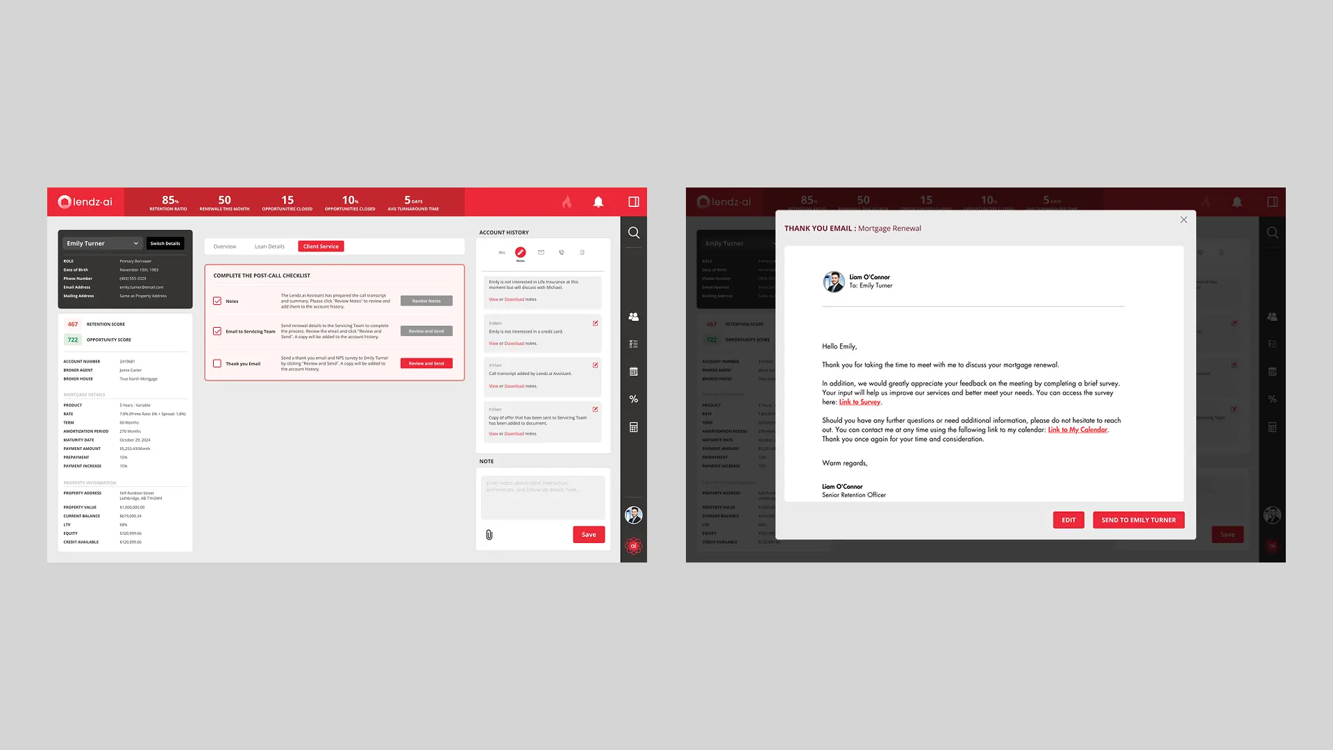 Lendz.ai keeps all client account activity, emails, and chat history in one centralized place — making it easy to pick up where anyone left off. Unlike traditional CRMs, data is tied to the account, not just the retention officer.