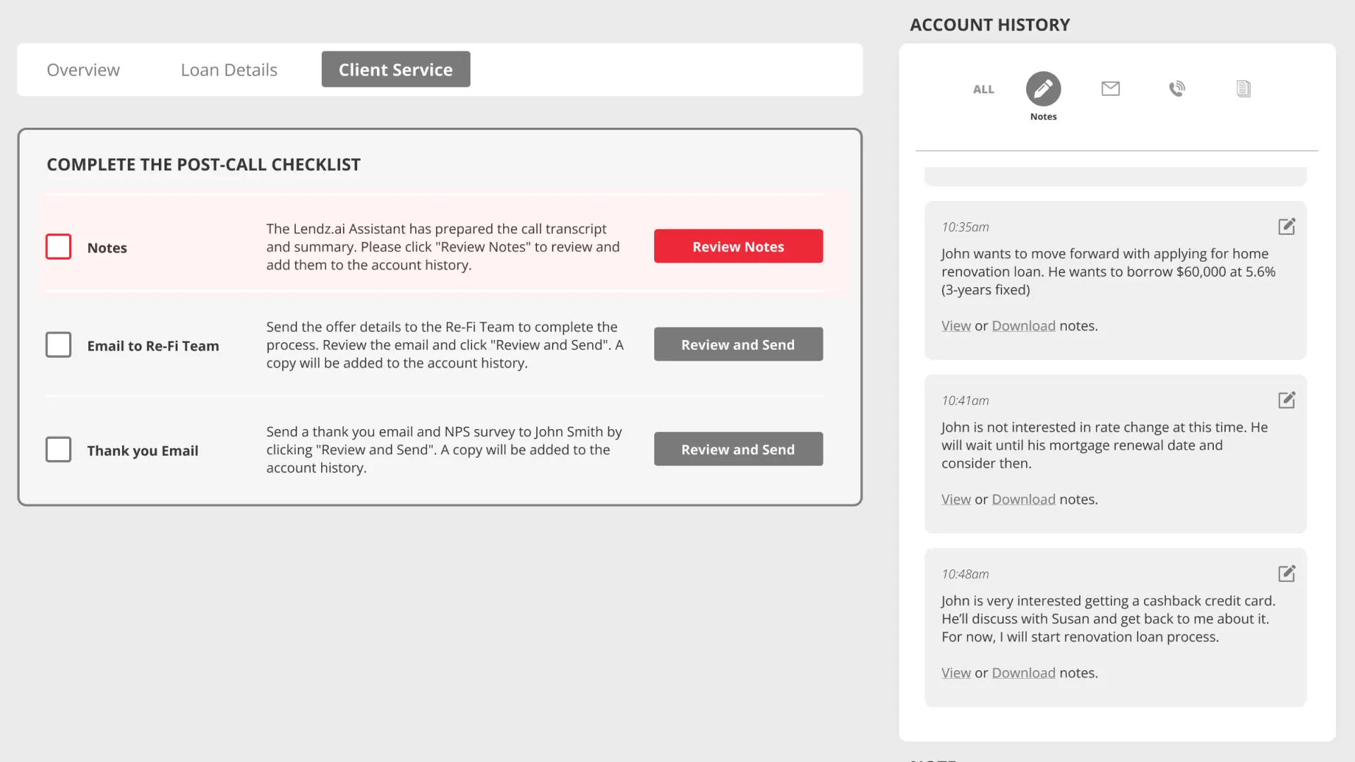 Lendz.ai automatically listens during client conversations and generates instant meeting notes and summaries for the mortgage retention officer.