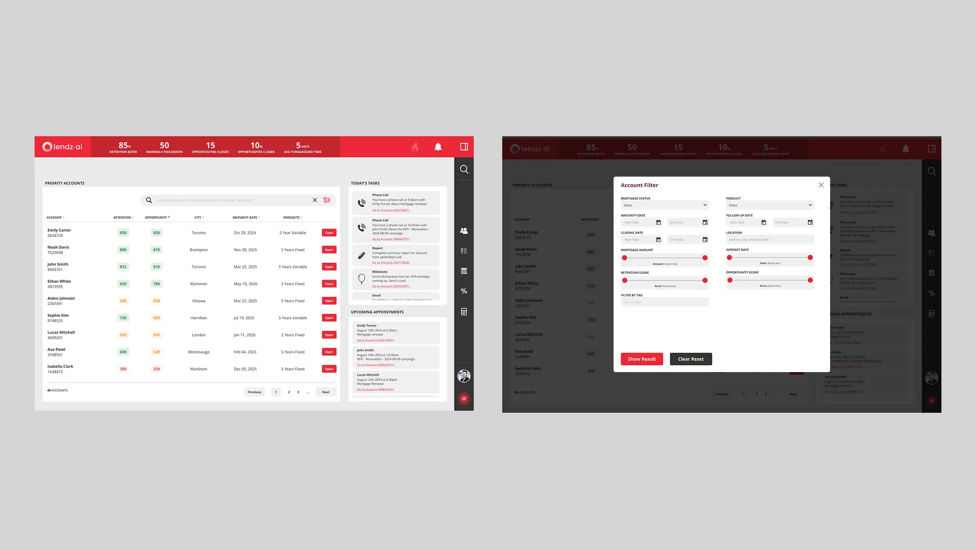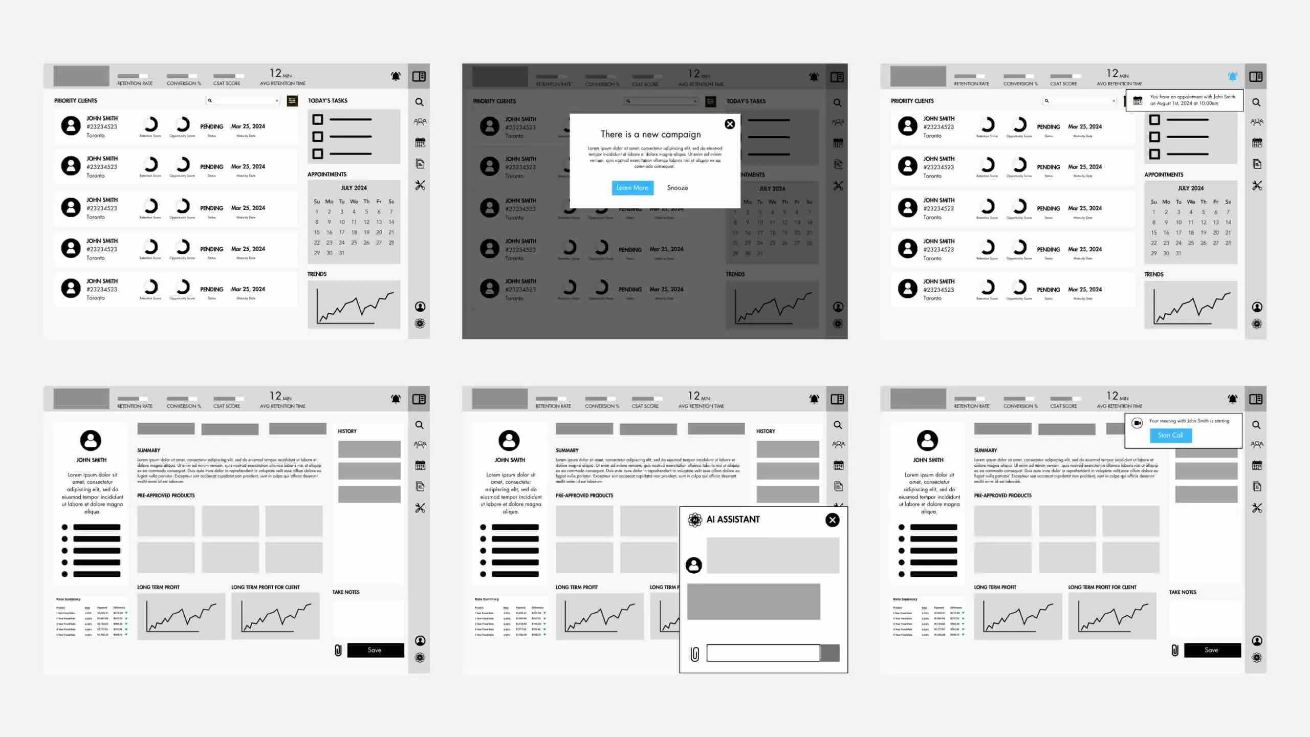 I created multiple prototype flows — including mid-term at-risk, mortgage renewal, campaign, and manager dashboards — to test with mortgage retention officers. We iterated based on real user feedback to refine the experience and address specific needs.
