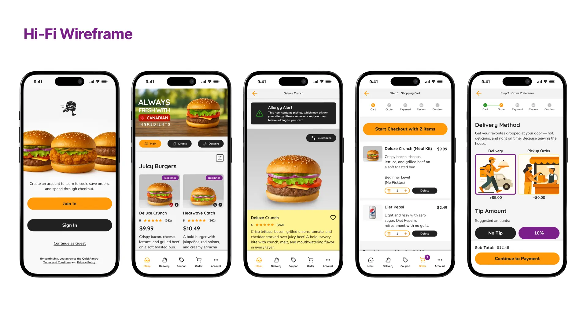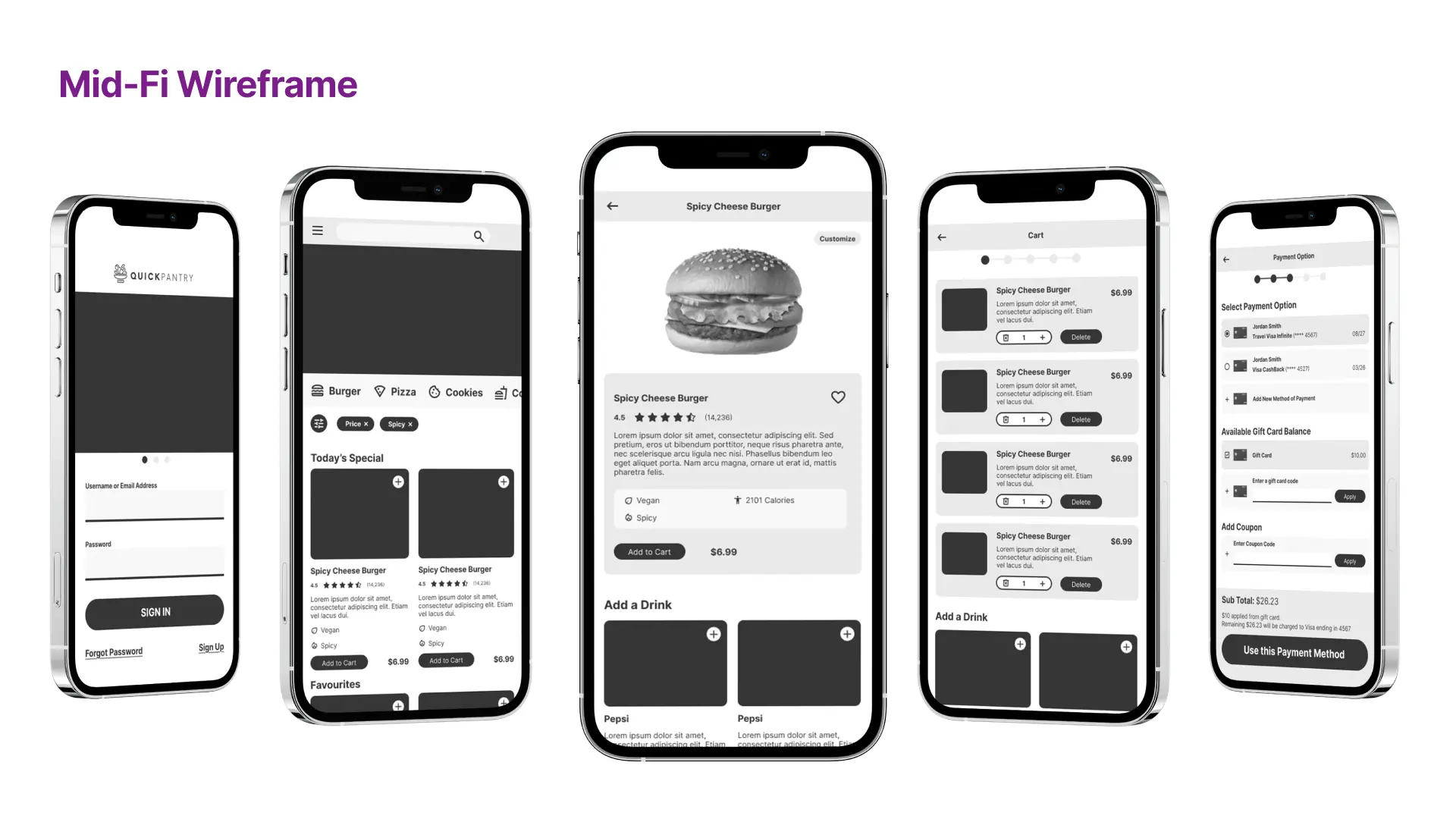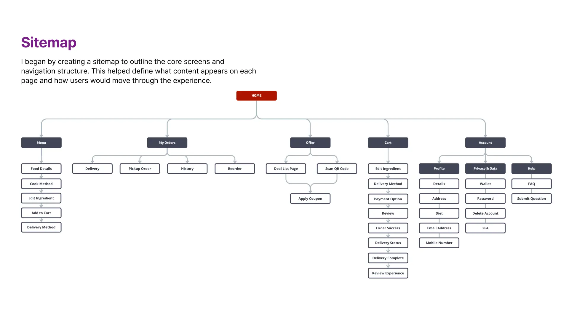 I created mid-fi wireframes to map out key user flows—from browsing and customizing meals to checkout and payment. These screens helped define layout, content hierarchy, and interaction patterns early on, allowing fast iteration before moving into visual design.