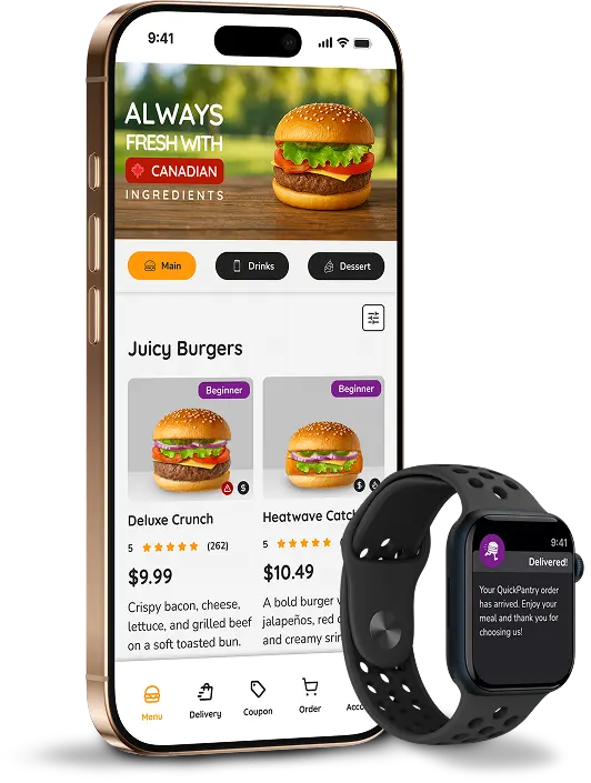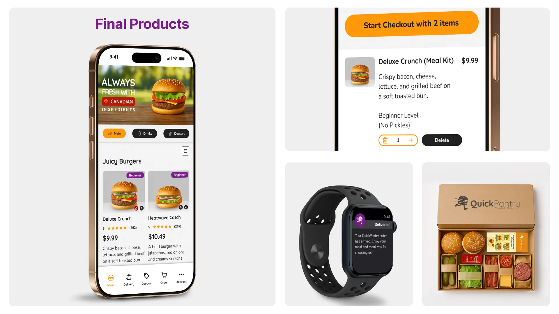High-fidelity screens were brought to life across mobile, smartwatch, and packaging touchpoints—highlighting the end-to-end QuickPantry experience. From ordering to delivery, the visual system reinforces clarity, trust, and convenience.