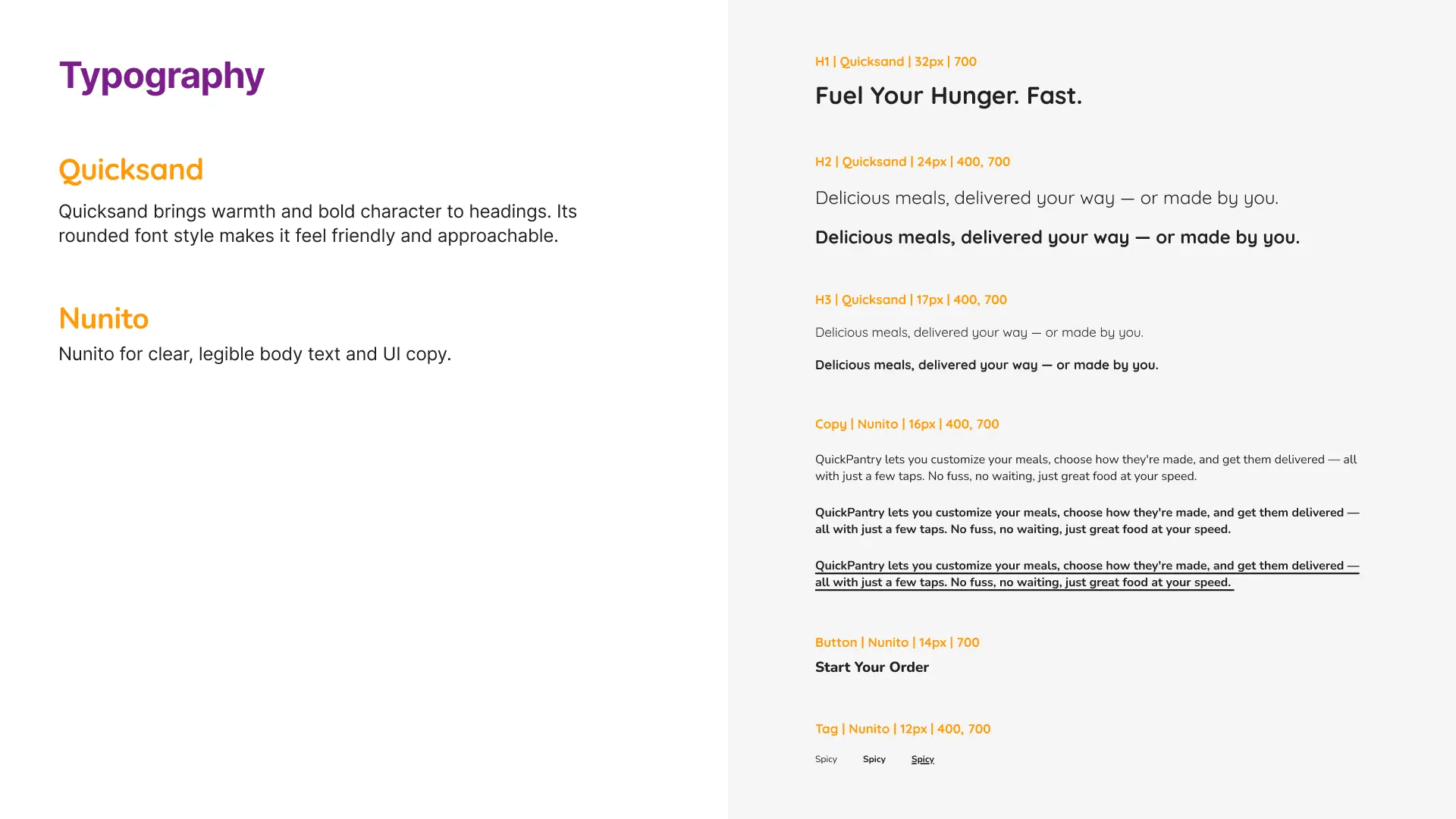 I used Quicksand for headings to bring warmth and personality, while Nunito supports clear, legible body text and UI copy. The combination balances friendliness with readability—ideal for fast decision-making in a food ordering experience.