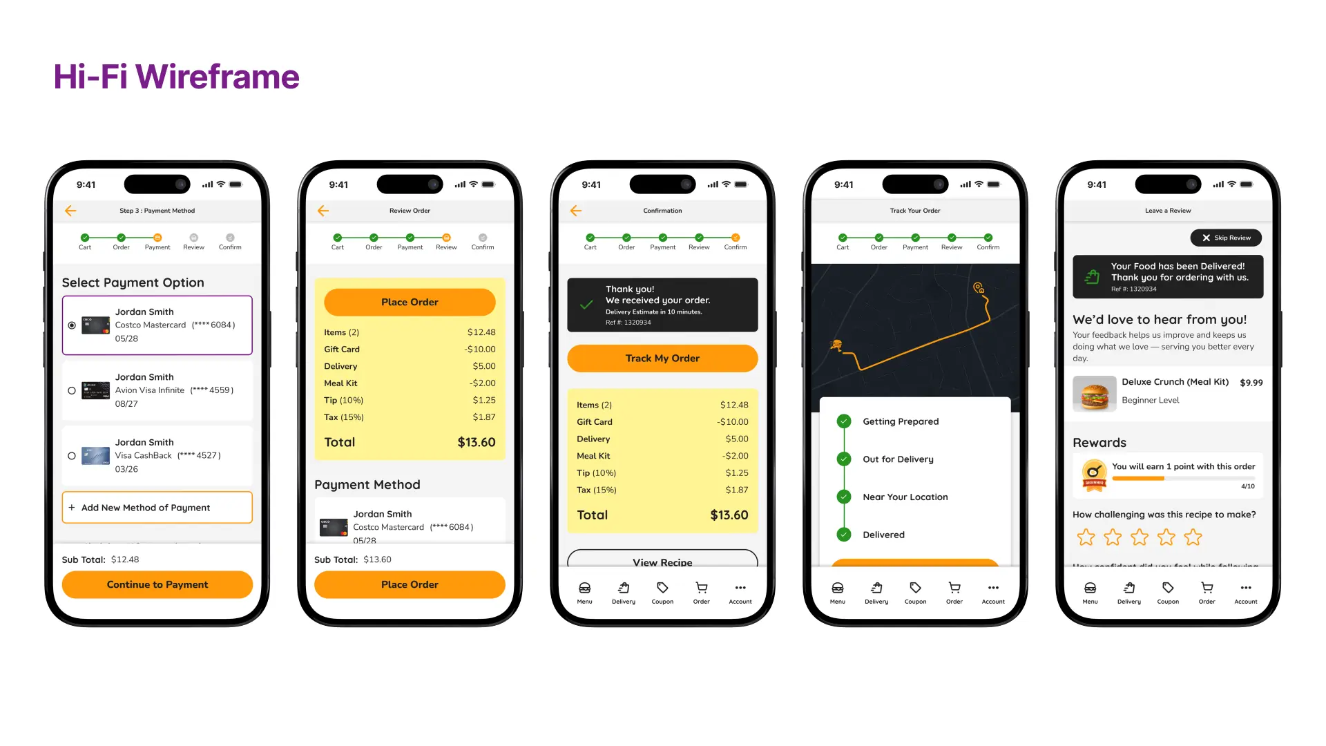 The second half of the experience focuses on payment, order tracking, and review. I designed each step to feel effortless, reassuring, and rewarding—ensuring users feel in control from confirmation to delivery.