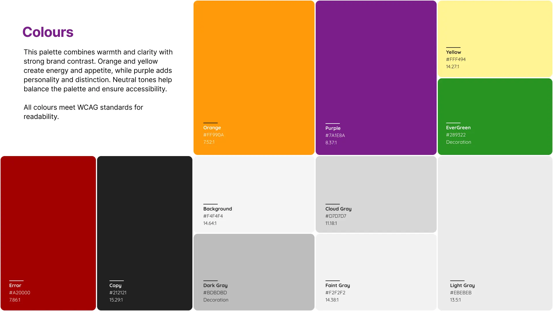 This palette combines warmth and clarity with strong brand contrast. Orange and yellow create energy and appetite, while purple adds personality and distinction. Neutral tones help balance the palette and ensure accessibility.