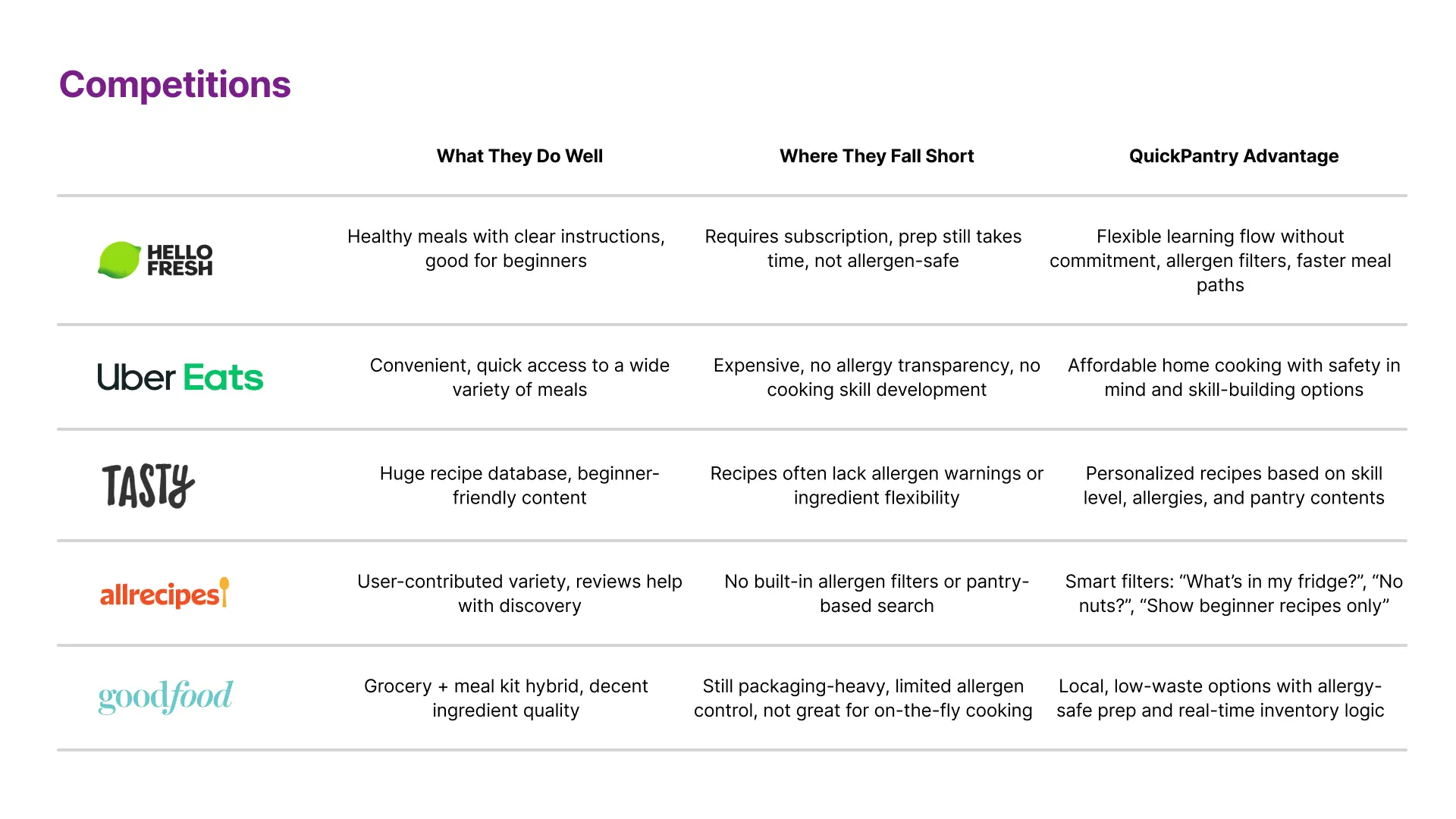 I evaluated leading food delivery and meal kit services to understand where they succeed—and where they fall short for busy users. While brands like HelloFresh and Uber Eats offer convenience or structure, they often sacrifice speed, flexibility, or health. QuickPantry stands out by combining the best of both worlds: fast, customizable meals with no commitment and less waste.