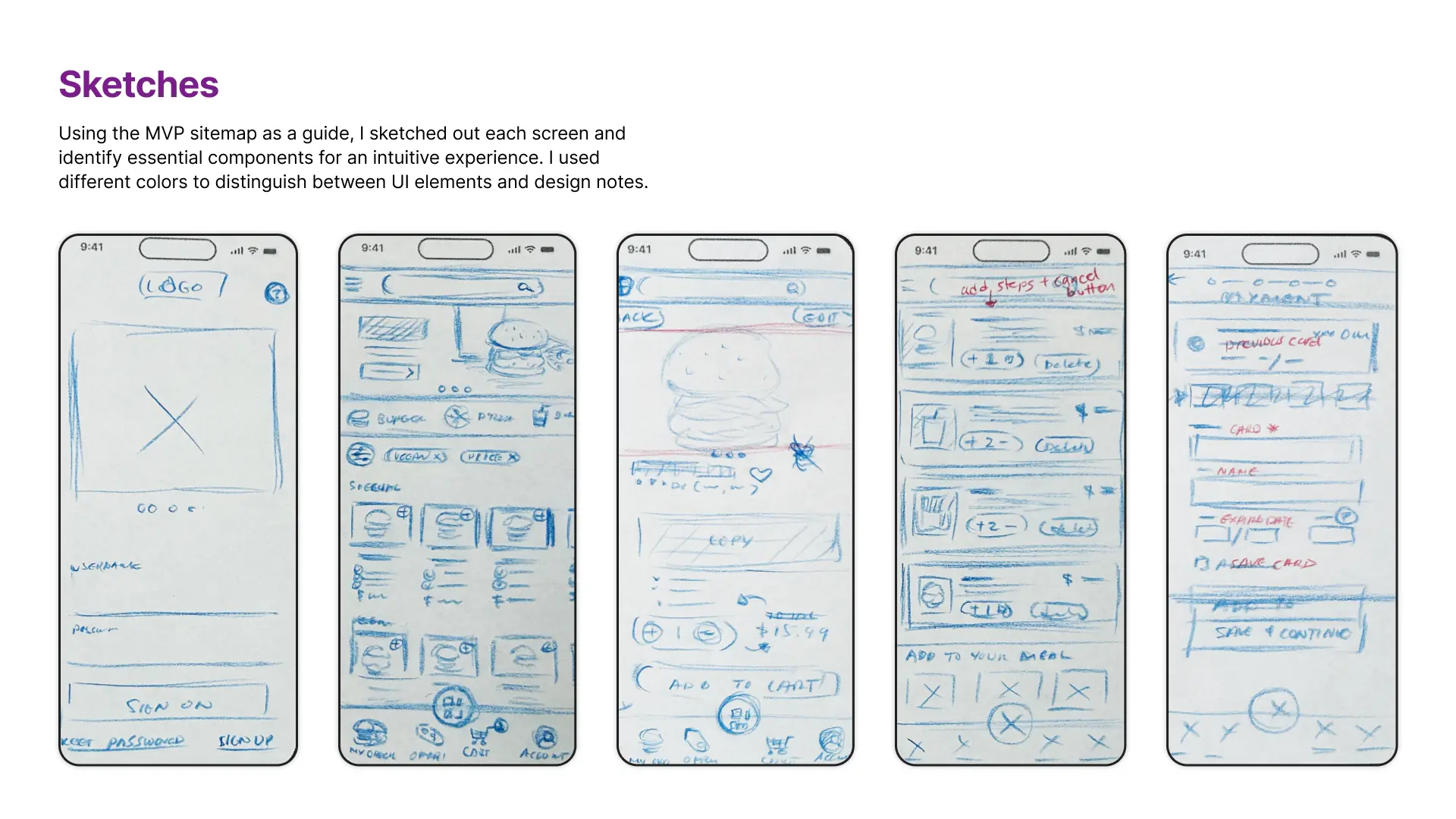 Using the MVP sitemap as a guide, I sketched out each screen and identify essential components for an intuitive experience. I used different colors to distinguish between UI elements and design notes.