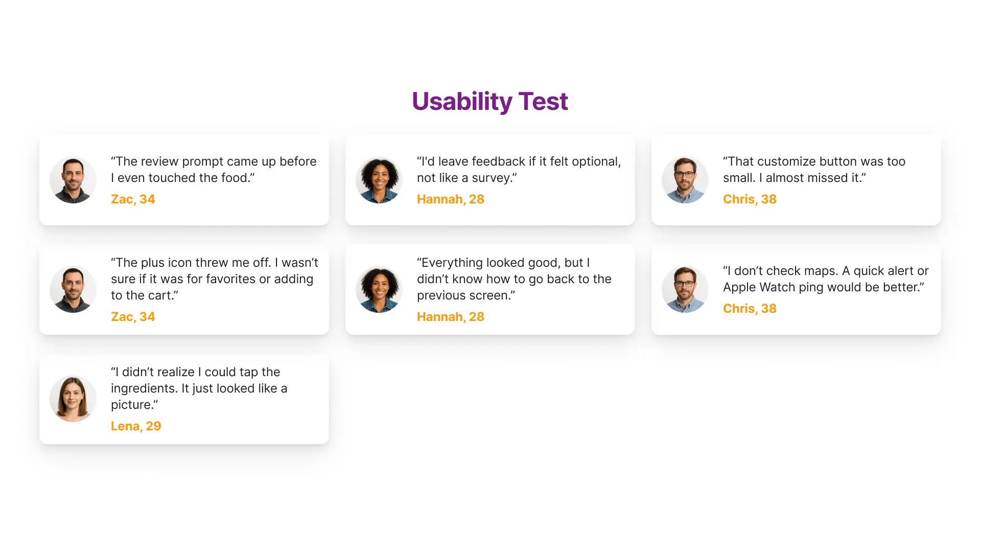 I gathered early feedback using an affinity map-style approach to identify friction points in the prototype. Users highlighted areas of confusion, like unclear icons, hidden interactions, and premature prompts—insights that guided the next round of design improvements.