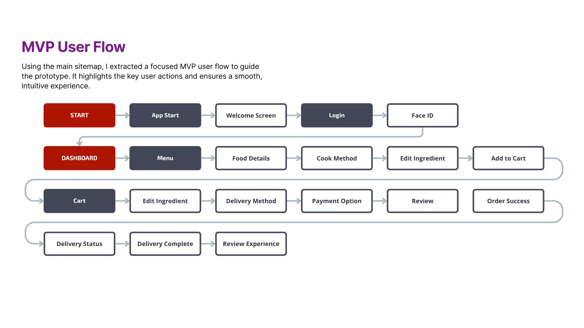 Using the main sitemap, I extracted a focused MVP user flow to guide the prototype. It highlights the key user actions and ensures a smooth, intuitive experience.
