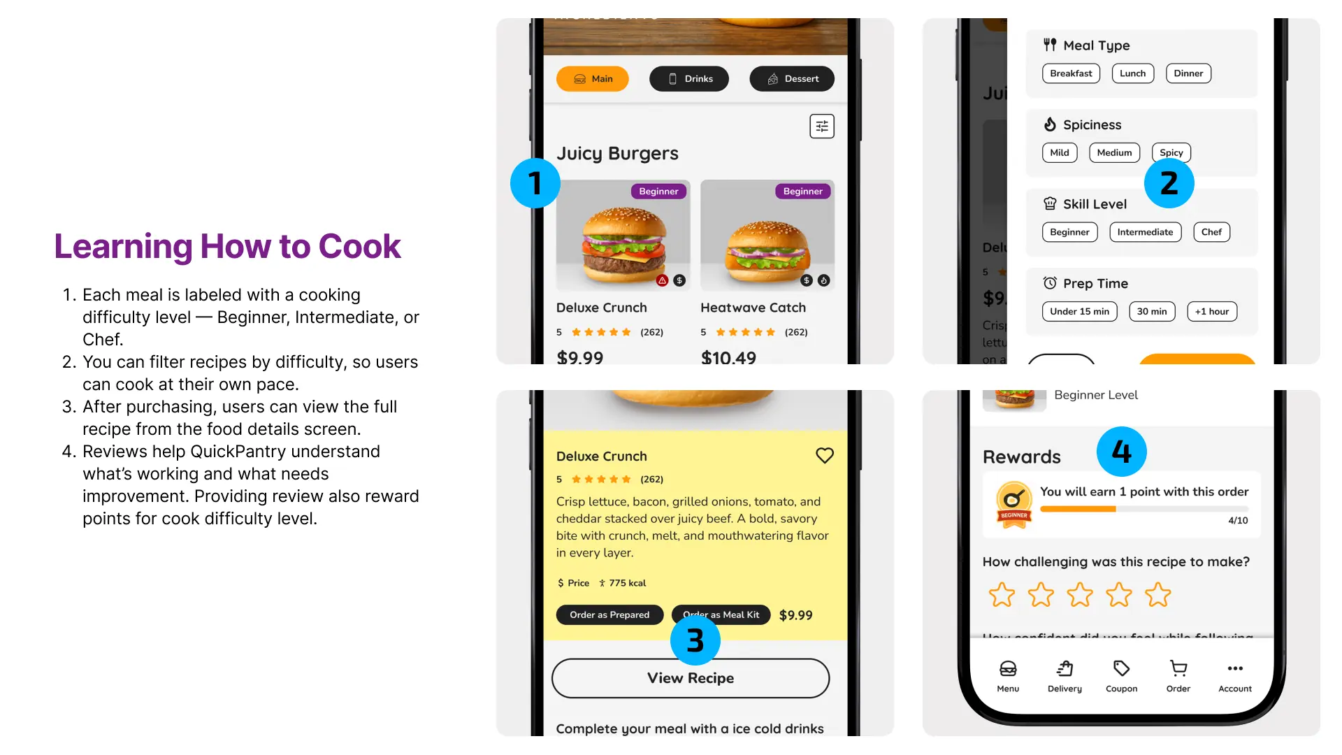 Reviews help QuickPantry understand what’s working and what needs improvement. Providing review also reward points for cook difficulty level.