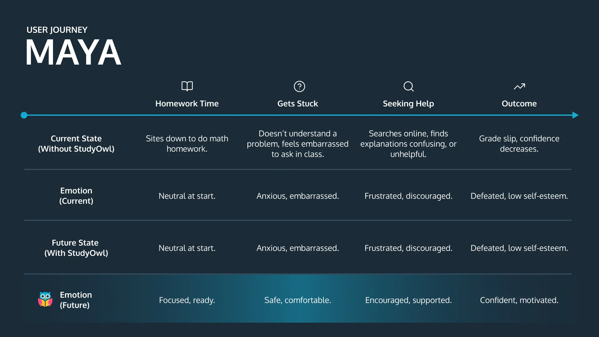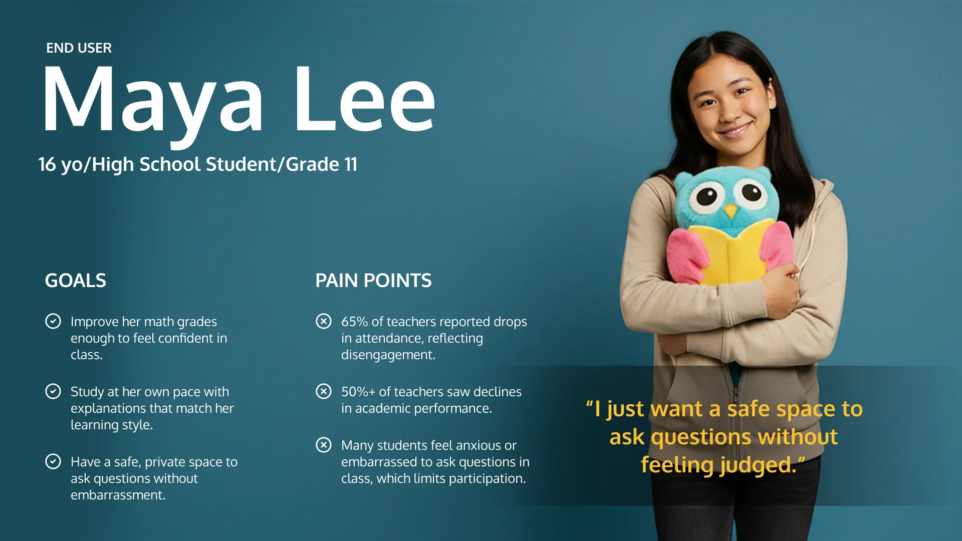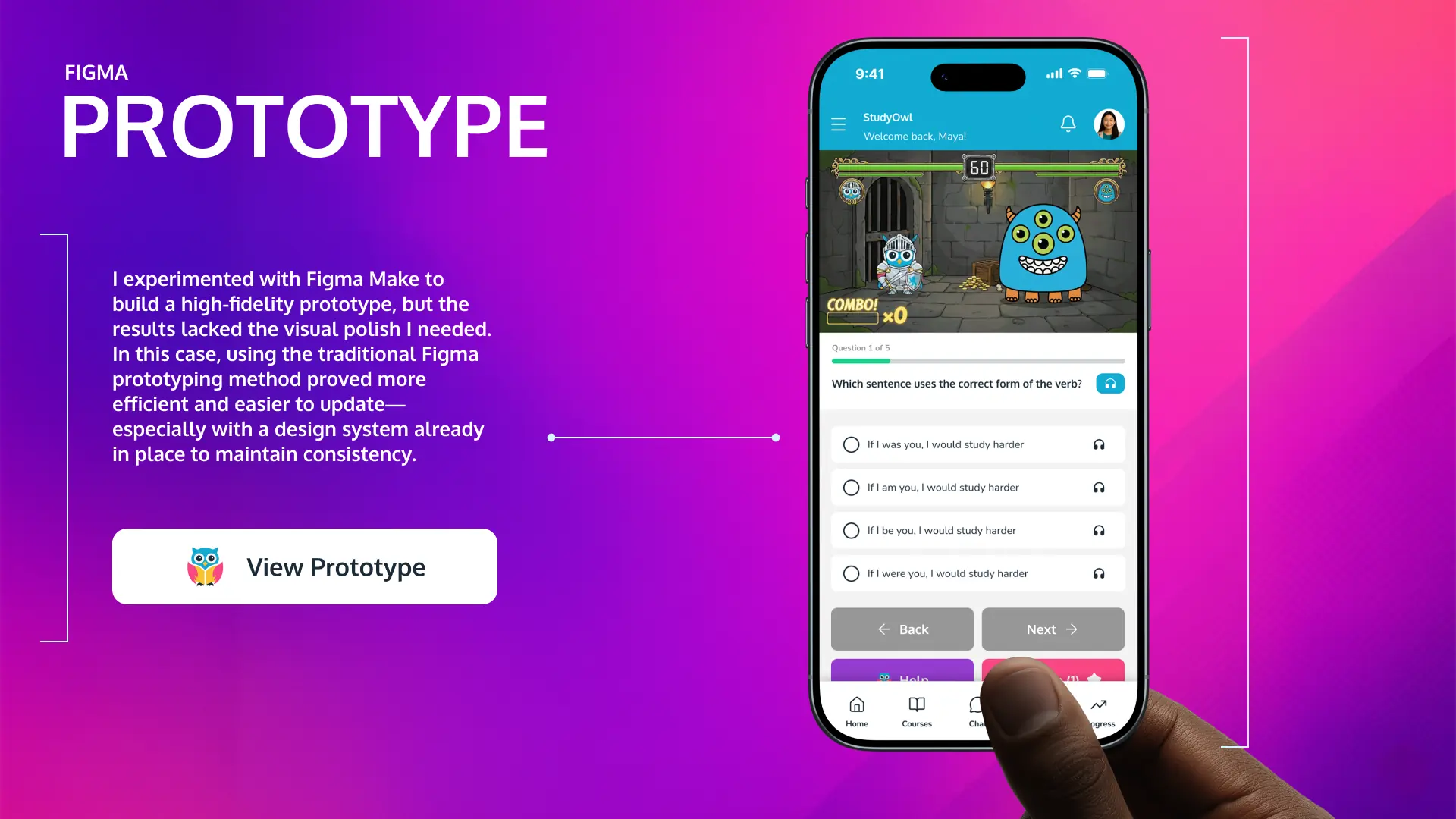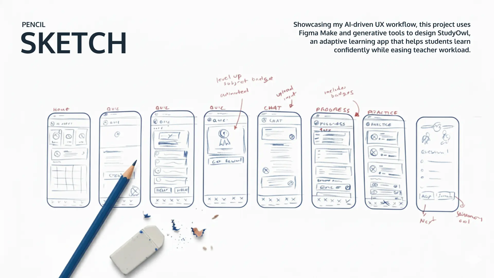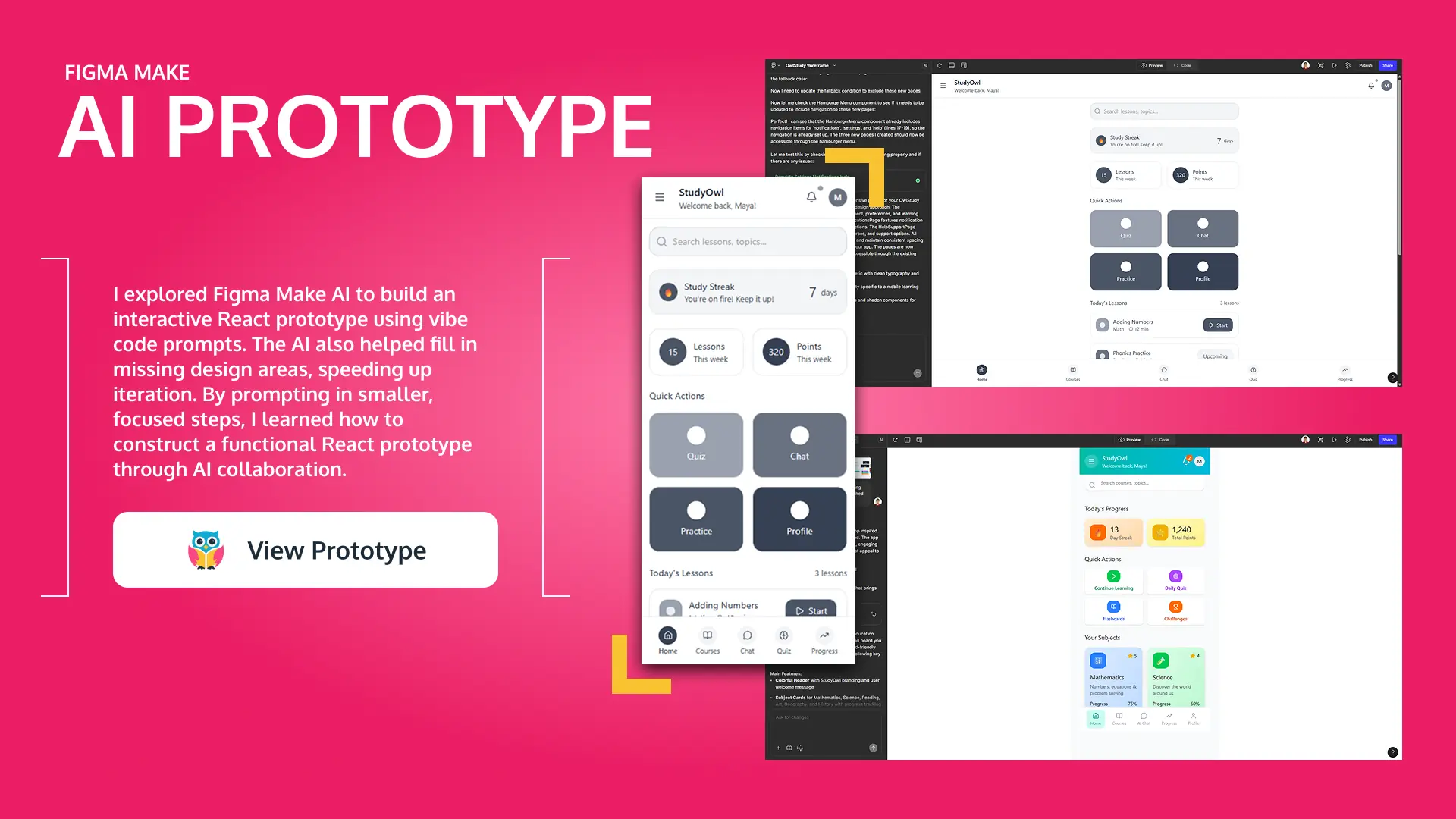 Showcasing my AI-driven UX workflow, this project uses Figma Make and generative tools to design StudyOwl, an adaptive learning app that helps students learn confidently while easing teacher workload.