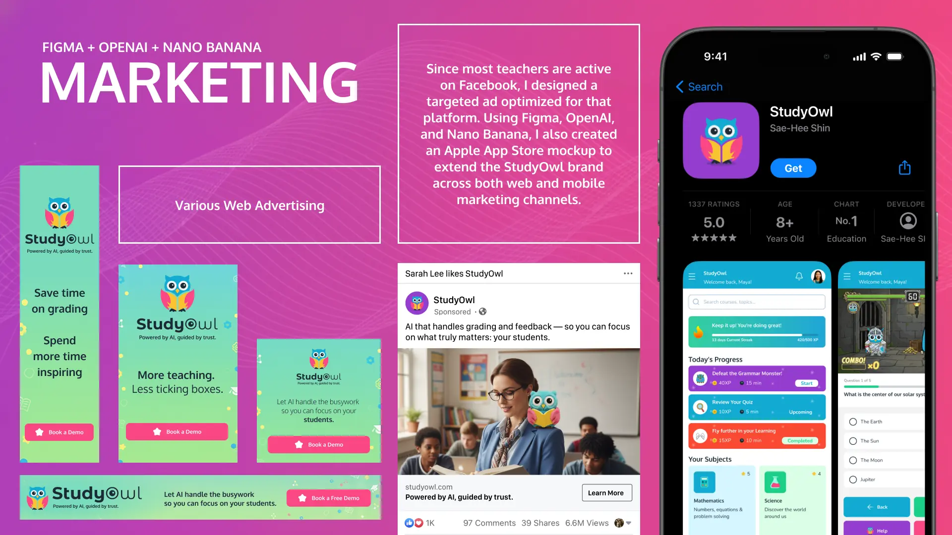 Since most teachers are active on Facebook, I designed a targeted ad optimized for that platform. Using Figma, OpenAI, and Nano Banana, I also created an Apple App Store mockup to extend the StudyOwl brand across both web and mobile marketing channels.