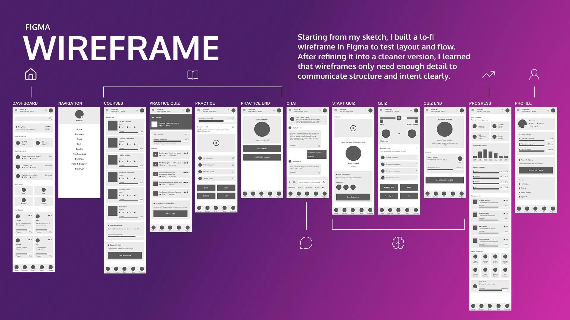 Starting from my sketch, I built a lo-fi wireframe in Figma to test layout and flow. After refining it into a cleaner version, I learned that wireframes only need enough detail to communicate structure and intent clearly.