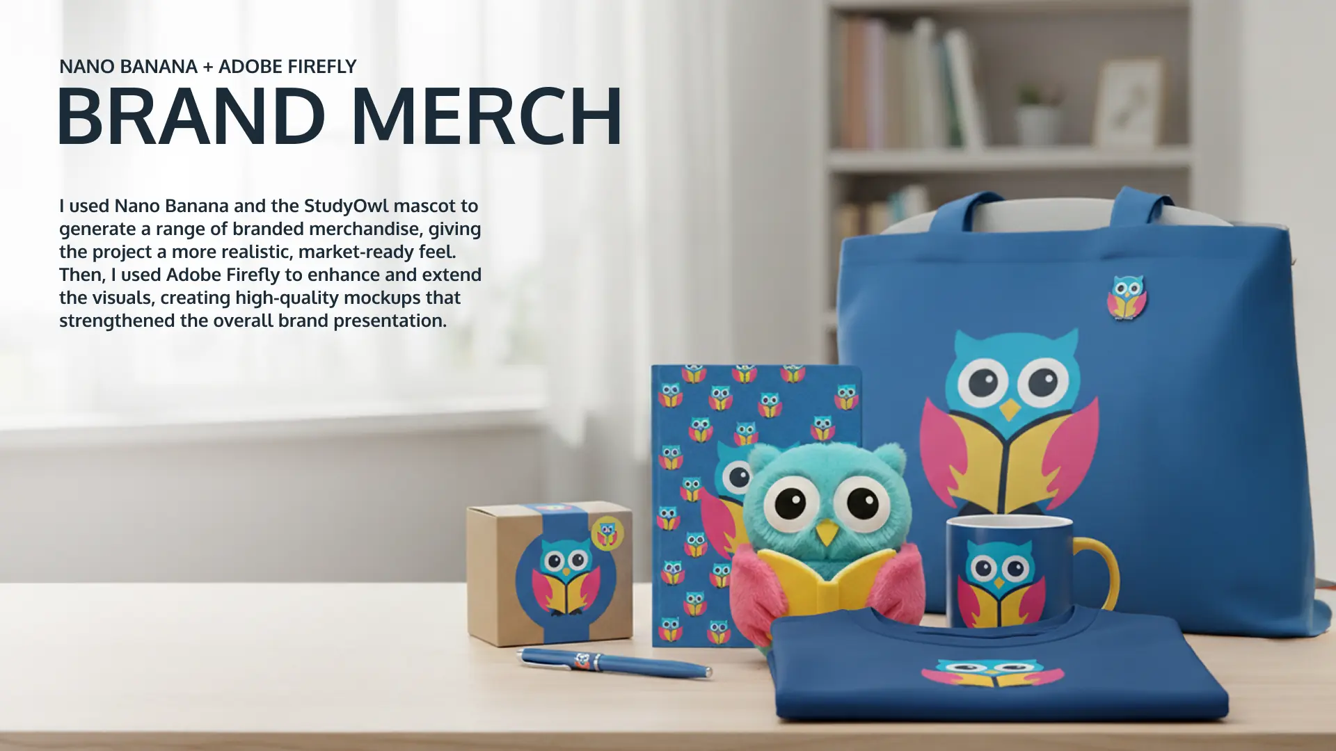 I used Nano Banana and the StudyOwl mascot to generate a range of branded merchandise, giving the project a more realistic, market-ready feel. Then, I used Adobe Firefly to enhance and extend the visuals, creating high-quality mockups that strengthened the overall brand presentation.