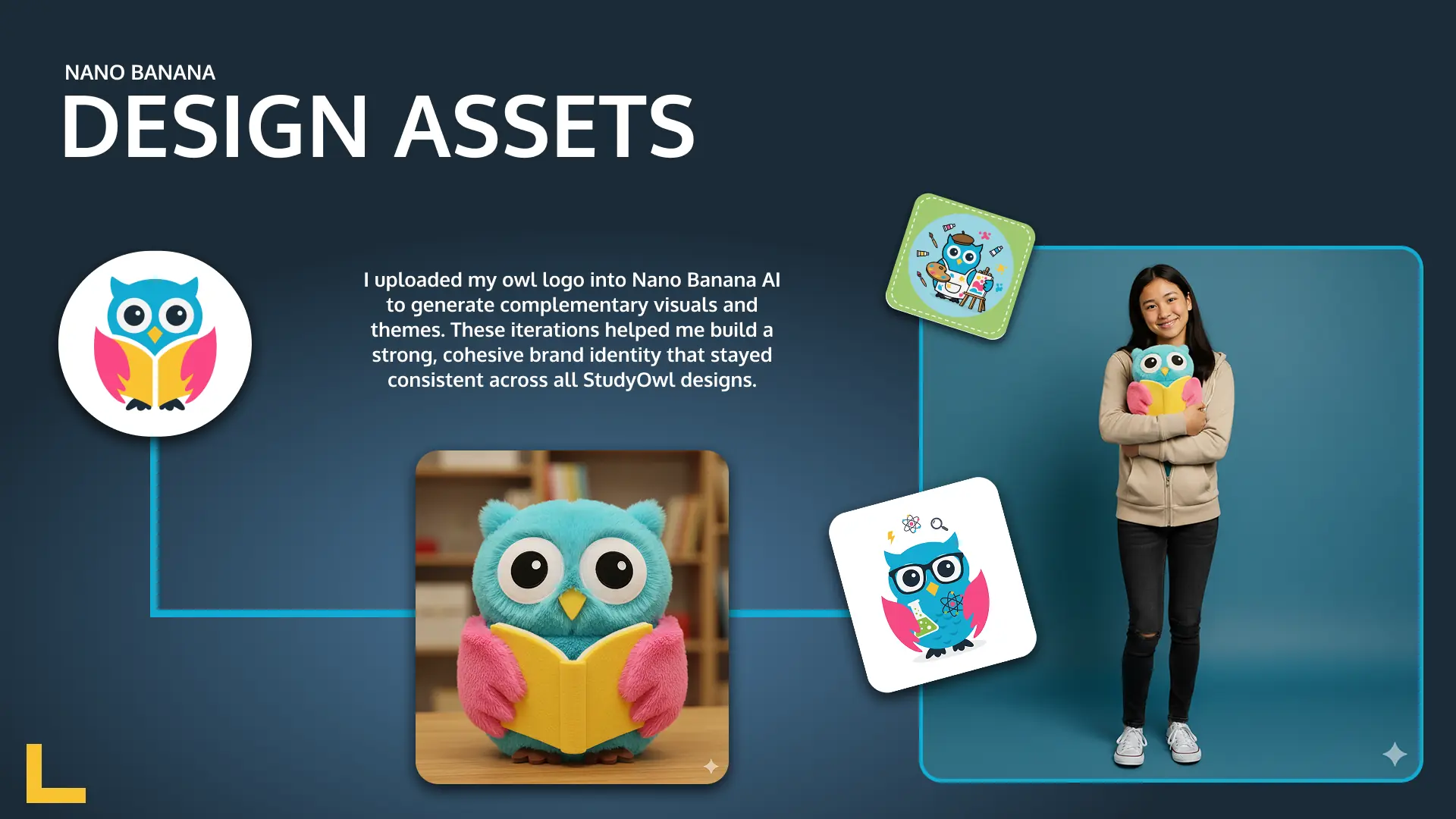 I uploaded my owl logo into Nano Banana AI to generate complementary visuals and themes. These iterations helped me build a strong, cohesive brand identity that stayed consistent across all StudyOwl designs.
