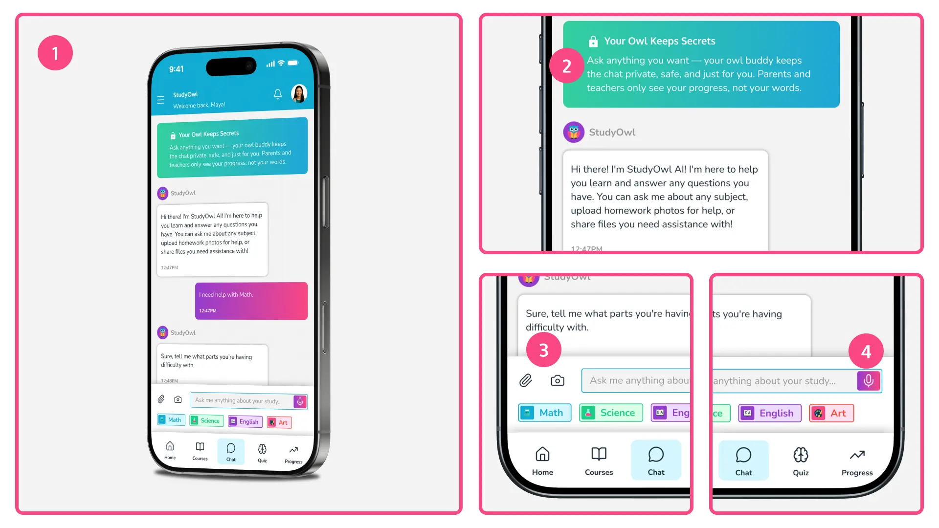 StudyOwl’s bright, colorful interface helps students track progress easily and get private, AI-powered homework help — making learning feel fun, supportive, and effortless.