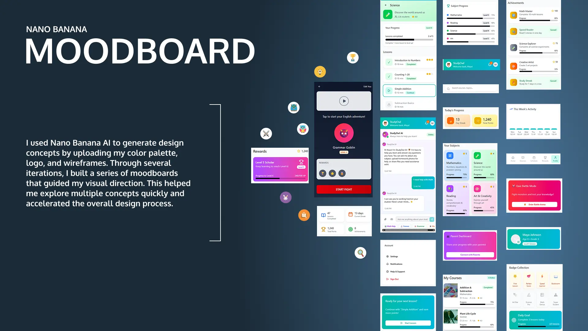 I used Nano Banana AI to generate design concepts by uploading my color palette, logo, and wireframes. Through several iterations, I built a series of moodboards that guided my visual direction. This helped me explore multiple concepts quickly and accelerated the overall design process.