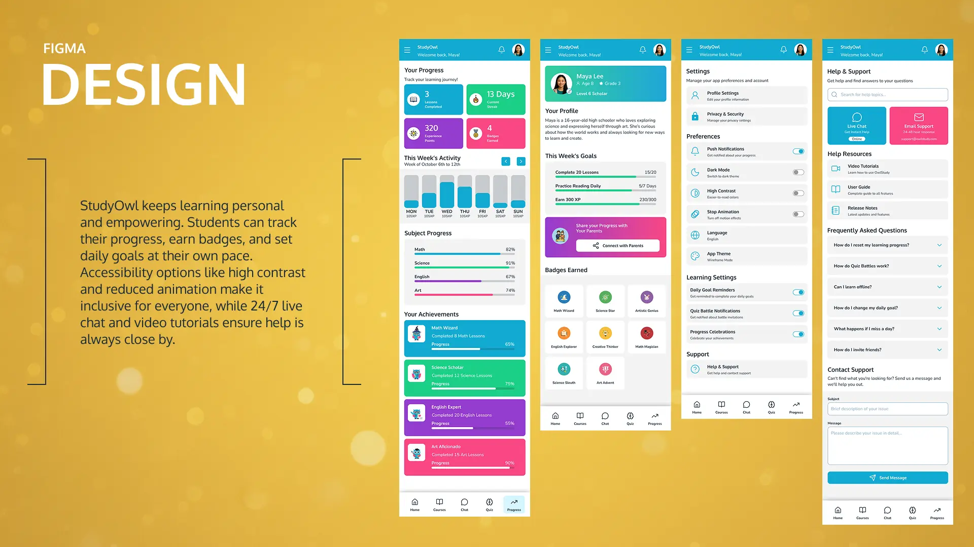 StudyOwl keeps learning personal and empowering. Students can track their progress, earn badges, and set daily goals at their own pace. Accessibility options like high contrast and reduced animation make it inclusive for everyone, while 24/7 live chat and video tutorials ensure help is always close by.